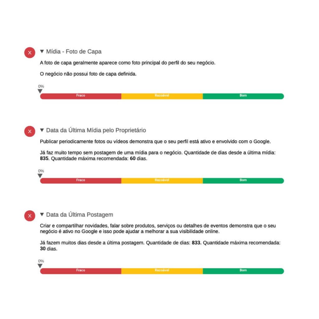O Relatório de Saúde analisa 24 aspectos do seu perfil (informações, fotos, avaliações, etc.) e mostra o que está bom, razoável ou fraco. O Relatório de Ranking mostra sua posição real nas buscas comparado aos concorrentes, com mapa visual de posicionamento.